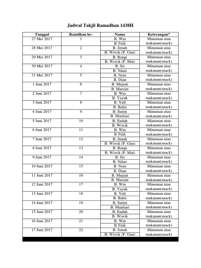 Contoh jadwal takjil ramadhan. Contoh undangan tahlil diatas siap anda edit sesuai dengan kebutuhan yang diperlukan. Daftar takjil berbuka puasa terpasang di depan Masjid Lempuyangan Kampung Lempuyangan Yogyakarta Rabu 74.