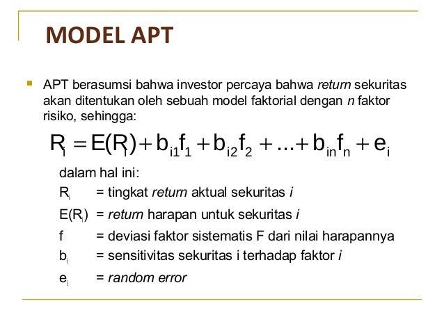 Kelebihan dan kekurangan dari masing masing model keseimbangan capm dan apt. I Imbal hasil sekuritas dapat dijelsakan dengan sebuah model factor ii Terdapat cukup banyak sekuritas untuk menghilangkan resiko istimewa dengan diversifikasi. 1 metode garis lurus 2 metode beban menurun yang terdiri dari.